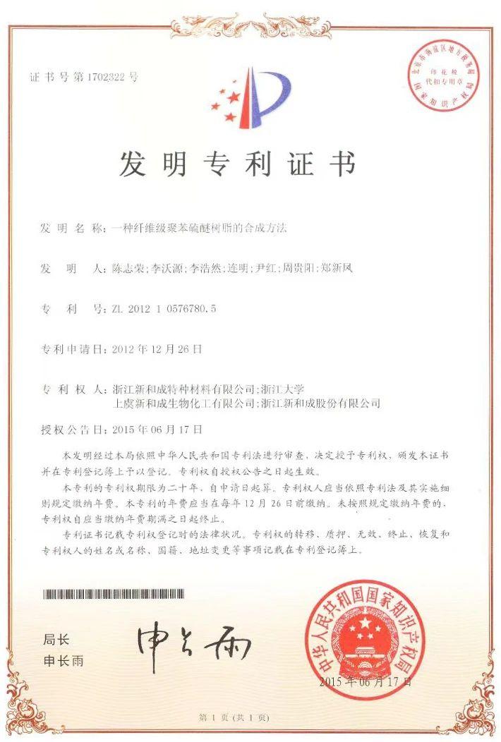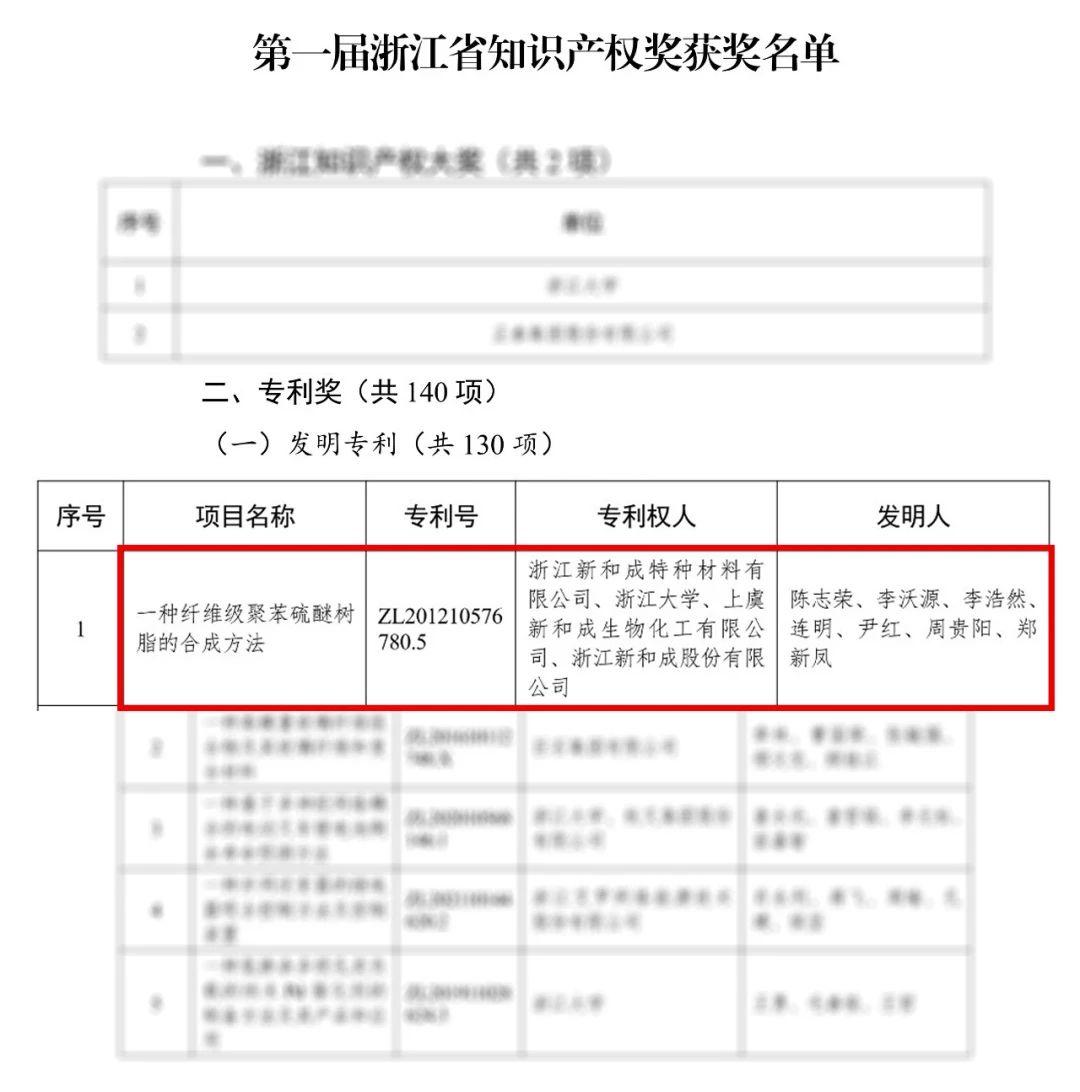 近日,根據《浙江省人民政府關(guān)于表彰第一屆浙江省知識產(chǎn)權獎獲獎?wù)叩臎Q定》,第一屆浙江省知識產(chǎn)權獎獲獎名單公布。浙江新和成特種材料有限公司聯(lián)合浙江大學(xué)、上虞新和成生物化工有限公司、浙江新和成股份有限公司共同申請的發(fā)明專(zhuān)利“一種纖維級聚苯硫醚樹(shù)脂的合成方法”( ZL201210576780.5)榮獲專(zhuān)利一等獎。